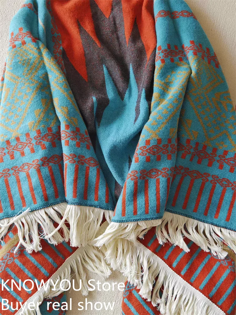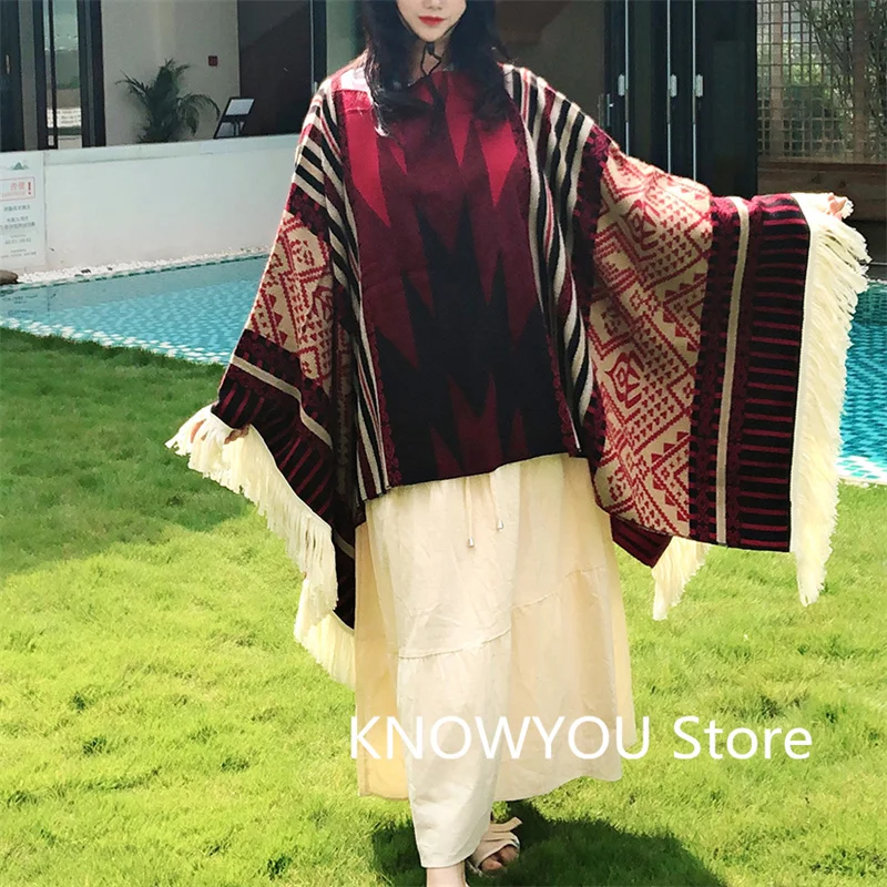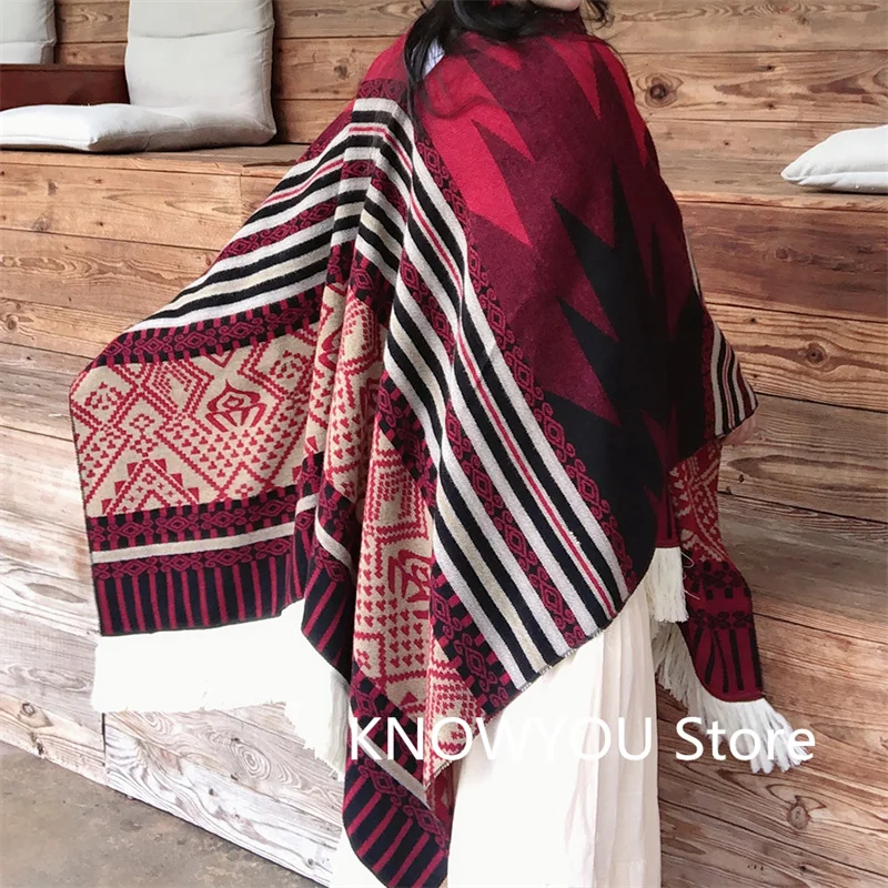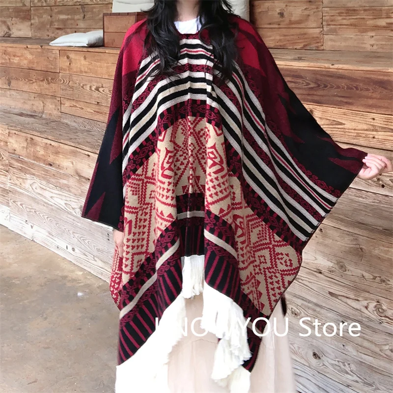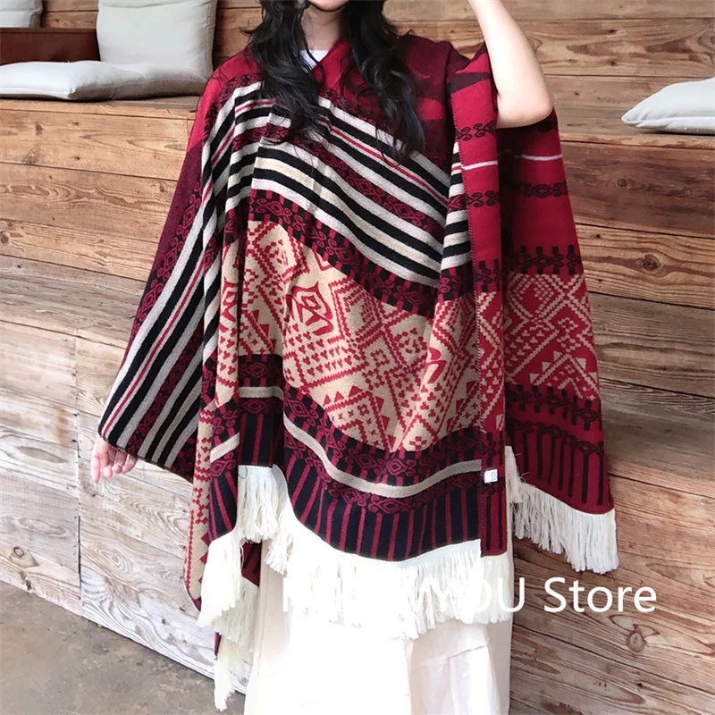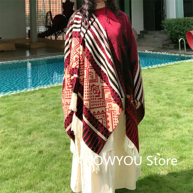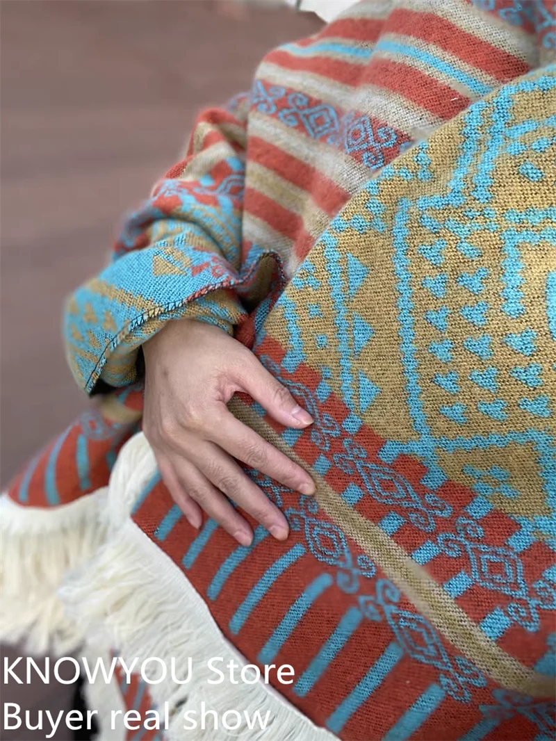 Traveling Women's Poncho Shawl Ethnic Style Tassels Hoodie Cloak Winter Warm Jacquard Outdoor Decoration Men Big Cape Blanket